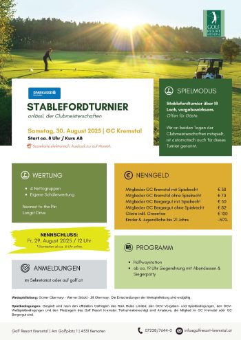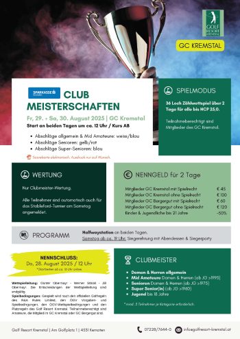 Ende August steht das Golf Resort Kremstal ganz im Zeichen spannender Wettkämpfe, sportlicher Höchstleistungen und geselliger Clubatmosphäre. Gleich drei Meisterschaften sorgen für ein unvergessliches Turnierwochenende – gekrönt von unserer traditionellen Siegerparty.